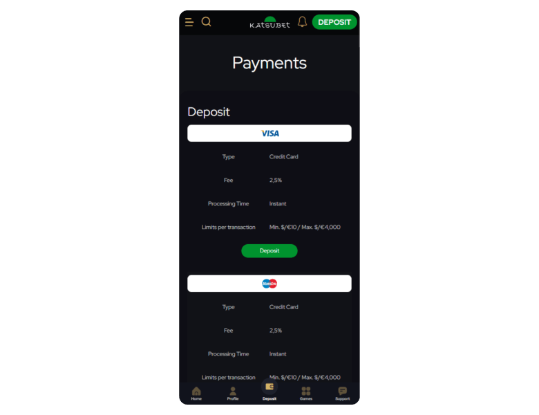 Deposit methods Deposit limits Deposit time