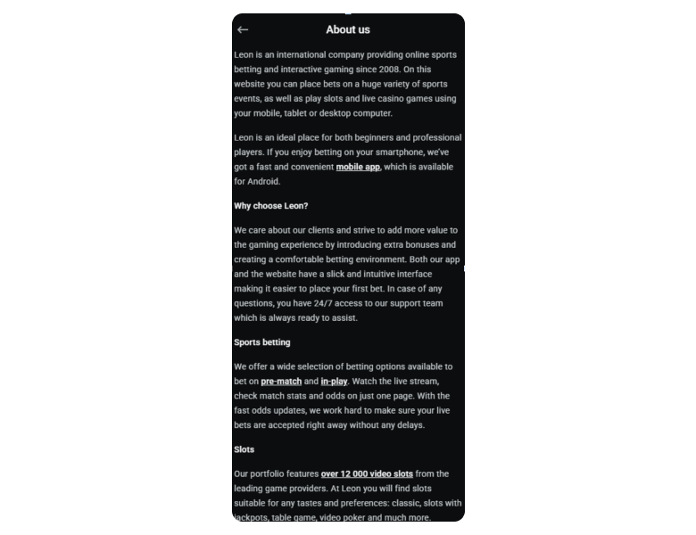 Screenshot of the main sections of the casino website: