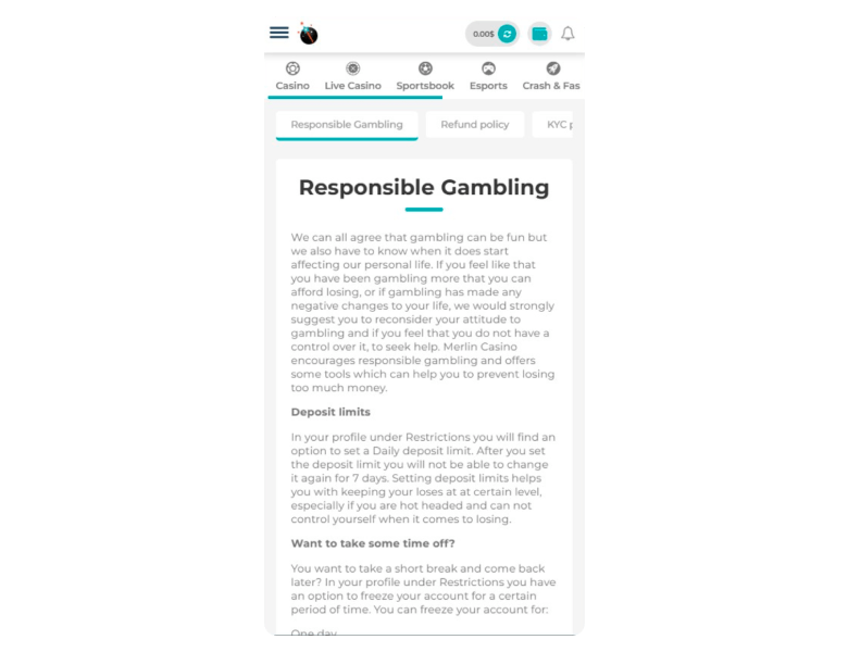 Merlin Casino promotes responsible play and offers tools like daily deposit limits. You can also freeze your account for short breaks (1 day, 3 days, 1 week, 1 month, or 1 year) or choose full self-exclusion. In case you need extra support, you can contact Gamblers Anonymous, GamCare, or Gambling Therapy. It’s a bummer they don’t have reality checks, though.