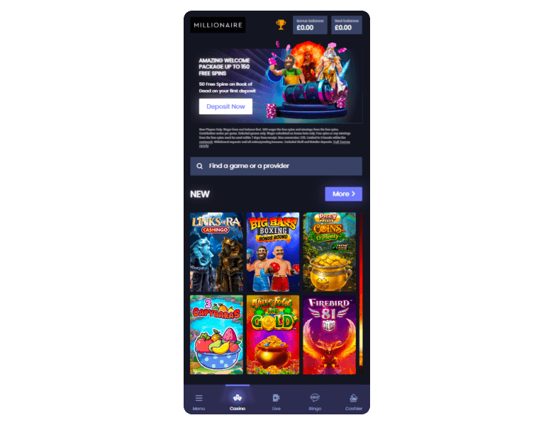 One morning, I woke up and thought I’d finally check whether Millionaire Casino lives up to its flashy name or not. The very first thing that caught my eye was the welcome offer: 150 free spins on Book of Dead with just 10x wagering. I’m pretty used to matching cash bonuses, but Play’n GO’s machines were always kinda doing it for me and the 10x wagering requirements were too attractive. Just a £10 dep and a couple of clicks, and I could start the journey.