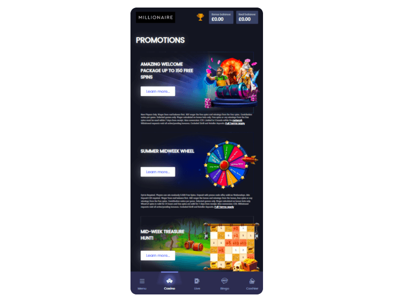 - Search for low-wagering promo offers — Millionaire’s 10x is good