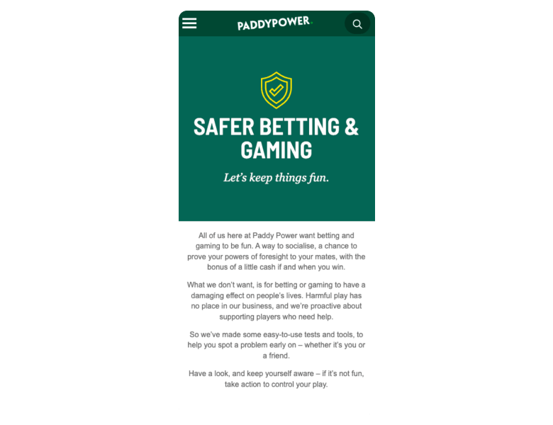 Paddy Power’s repertoire of responsible gaming tools contains almost every standard feature you’d expect. I noticed time limits or reality checks with consistent reminders at intervals of 15, 30, 60, and 90 minutes. The self-exclusion option requires the aid of the support team, which I’d say could have been better if you could just do it yourself. However, you can get help from external organizations using the contacts they’ve provided, and that’s a plus.
