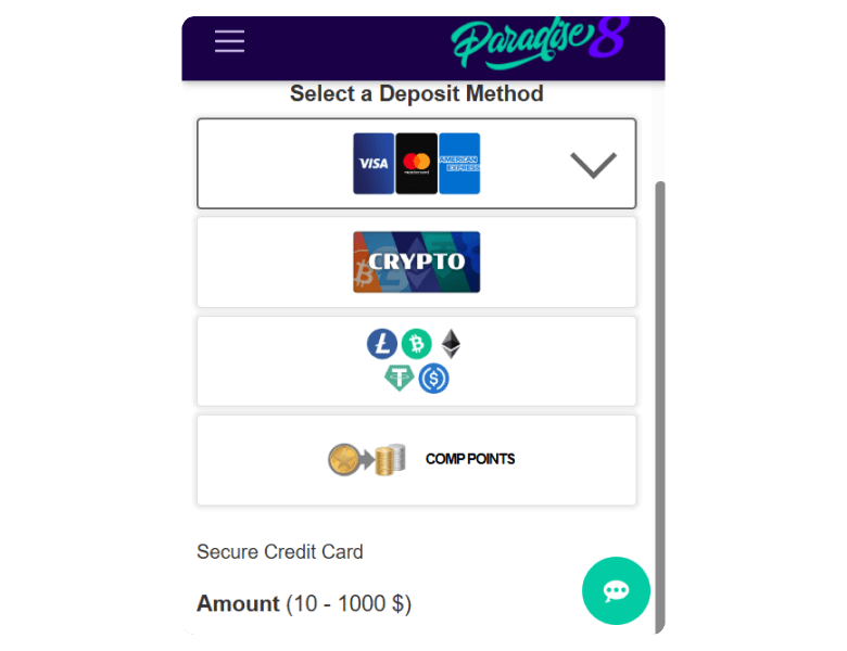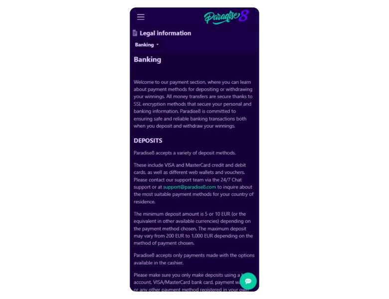 Paradise 8 gives you the option to pay and receive money with credit/debit cards, bank wires, e-wallets, and cryptocurrencies. Methods like Visa, Mastercard, American Express, MiFinity, and Bitcoin are available. See which ones are good for deposits, and which ones — for cashouts.