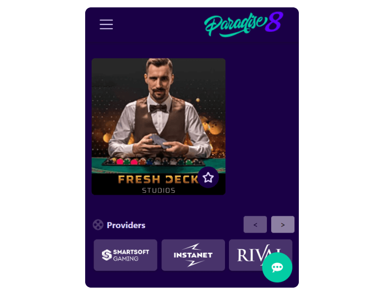 Paradise 8 delivers 15 live games from Fresh Deck Studios and VIVO Gaming — a minimal but functional package.