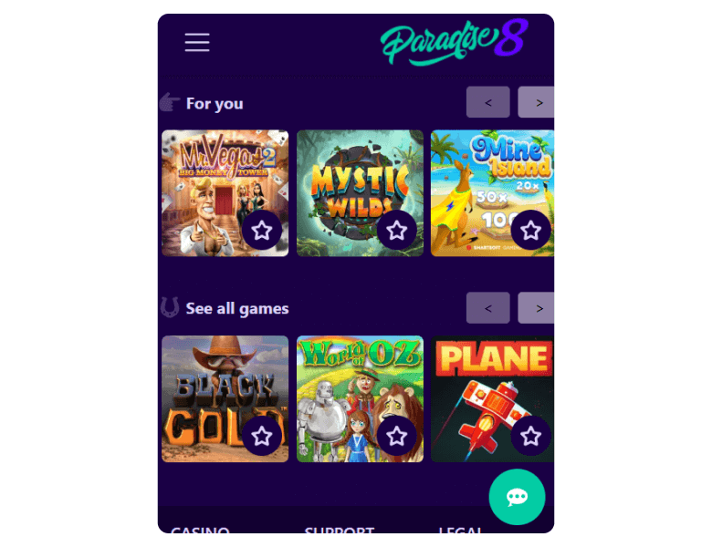 Paradise 8 looks to me as your homey choice for someone who enjoys playing the main variants of Roulette and Blackjack. The European and American ones are there. I also found a title that will suit high rollers — although they will feel challenged by the initial casino withdrawal caps. On the whole, not bad, but the casino has a lot of catching up to the likes of Boho Casino (over 1,200 games).