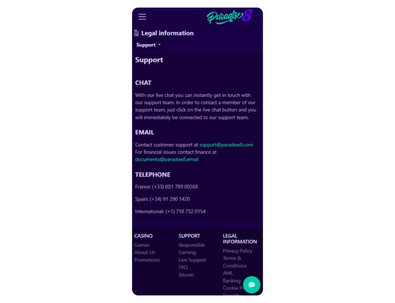 Paradise8 offers a 24/7 customer support service with consistent quality. You can speak to them at: