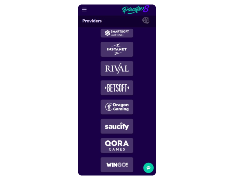 The list of collaborators with the Paradise 8 Casino includes names like Betsoft, Fugaso, Rival, Spinomenal, and Tom Horn. See a more detailed look in the table below.