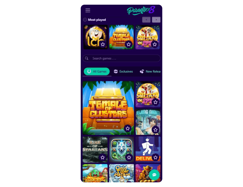 Paradise 8 leaves few stones unturned when it comes to games. The casino delivers 781 games from high-quality developers, games which you can try for free in demo mode. Slots represent the lion’s share of the 95% RTP library — 692.