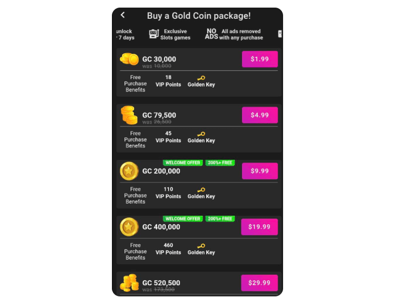 Note that while you can purchase GC, you can only receive SC as part of promotional Gold Coin packages or through free offers.