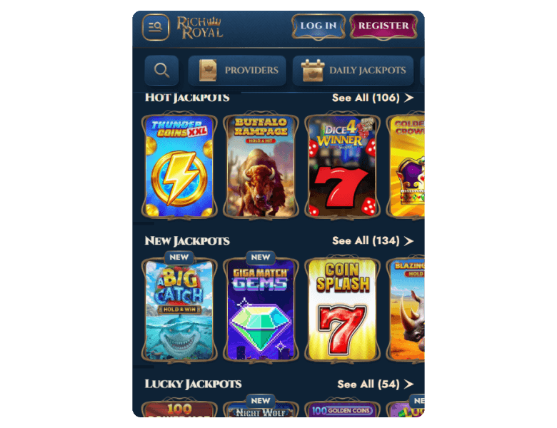 RichRoyal uses over 95 providers, including Microgaming, Hacksaw, Play’n GO, and Swintt. That’s a big number and gives you the flexibility to choose what games you want to play based on the provider's creativity.