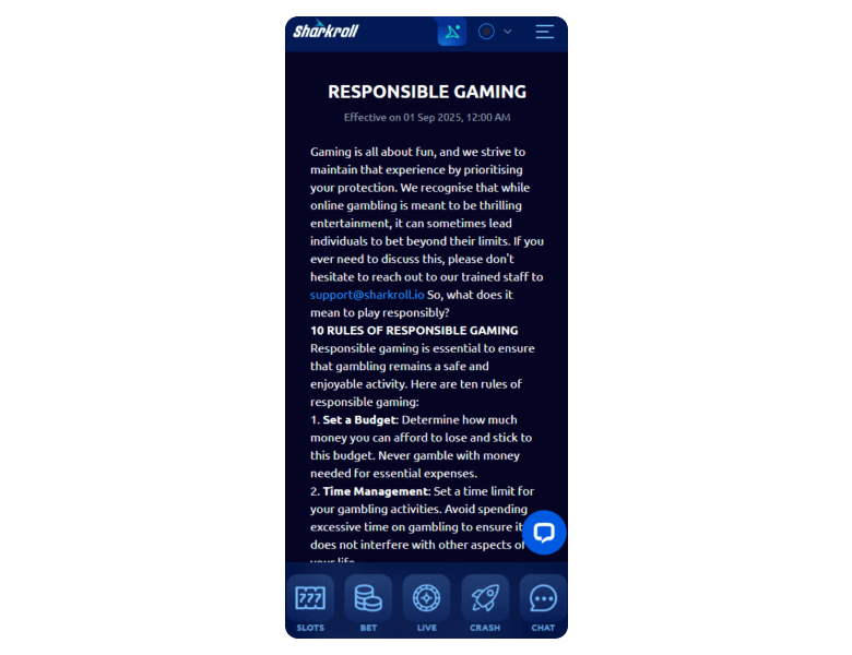 You can get your queries resolved on Sharkroll Casino by sending an email or hitting the floating blue chat button to talk to an agent. An FAQ page and help center are also available, just in case you prefer the self-help route.