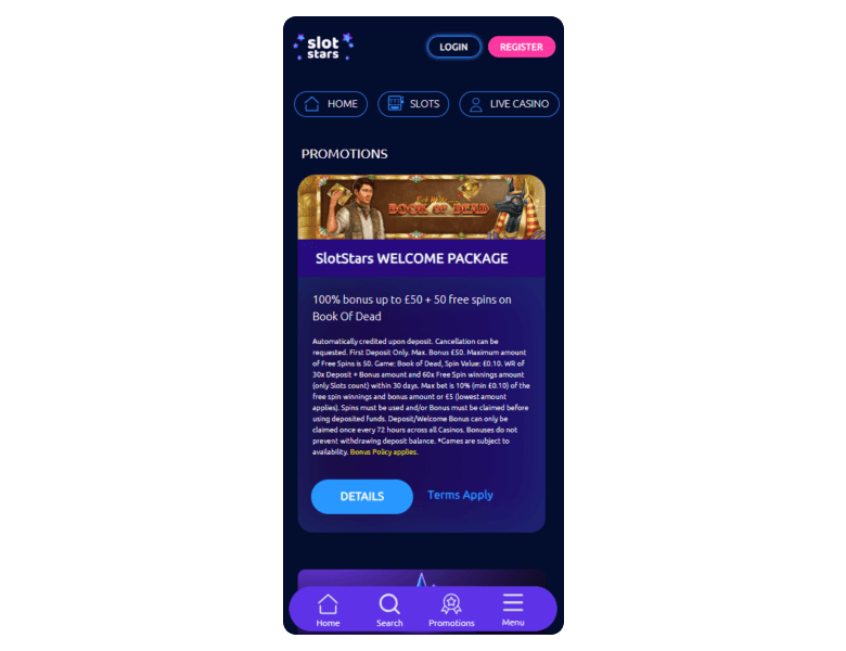 SlotStars operates under a license issued by the UKGC and has an iTech Labs certificate. I decided to give it a try to access its collection of 7,411+ games with an average RTP rate of 96%.
