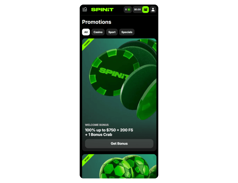 SpinIt Casino launched in 2025 and looks ready to serve players from Canada, Australia, New Zealand, South Africa, and most of Europe. It runs strictly as an online casino and sportsbook, so don’t expect poker rooms. What you get instead is a heavy focus on slot games, live tables, and crypto payments.