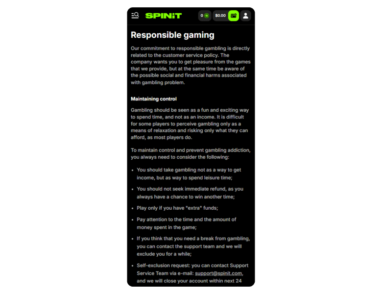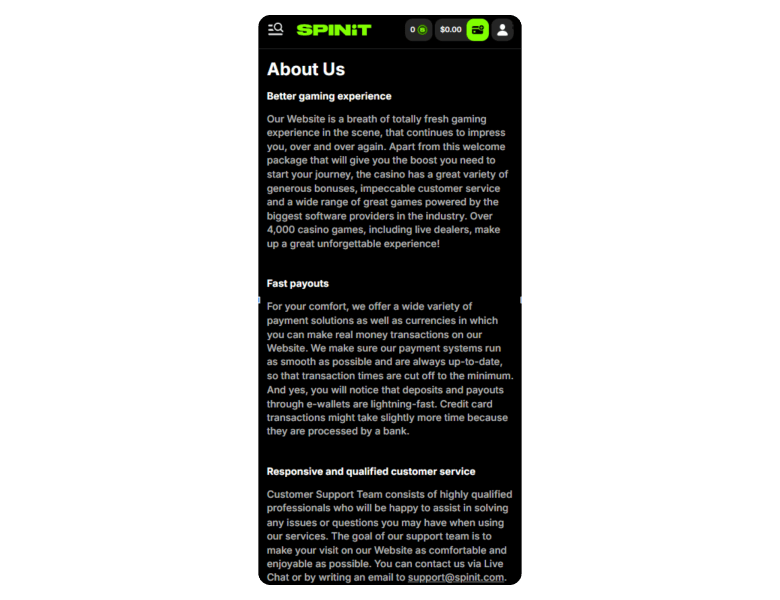 SpinIt doesn’t have a dedicated casino app, but the mobile browser version works without glitches. I tested it on both Android and iOS, and all the main features, from deposits to live games, were accessible and fast. The layout matches the desktop version, so there’s no need to relearn where things are.