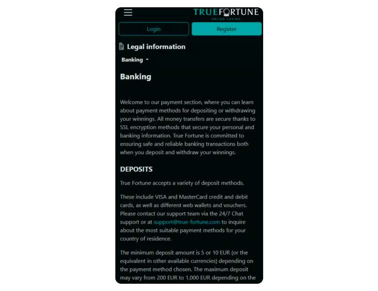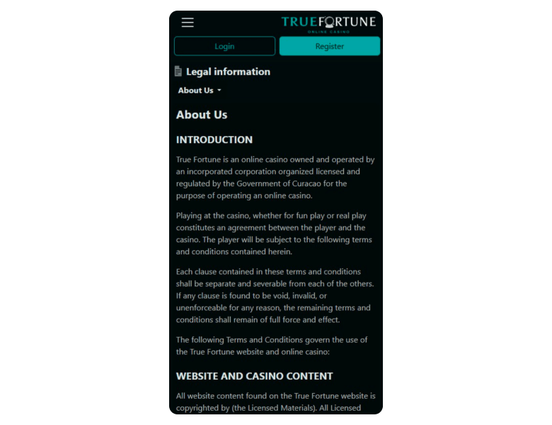 True Fortune operates under a Curacao licence. What it means for players is that they get basic regulatory protection. On the security side, I found out they use 128-bit SSL encryption, which is basically the same level banks use. Still, I’d feel better if independent RNG audit certificates were also obtained and then shown on the site.