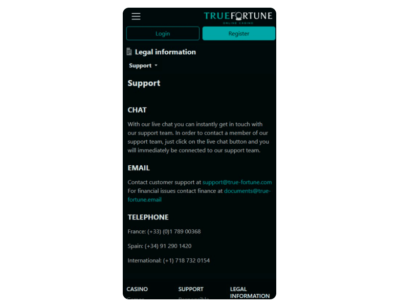 To begin with, True Fortune Online Casino has a detailed FAQ area with questions across 8 categories, from registration to payments, and those are pretty much handy. But when it’s not enough anymore, there are 3 different ways to reach the support team. Live chat replies usually took me a couple of minutes to get a reply, email responses usually came within 4 hours, and phone support is actually what surprised me in a good way, since not many online casinos still offer it. However, at peak times, you sometimes have to call a couple of times before you finally get connected.