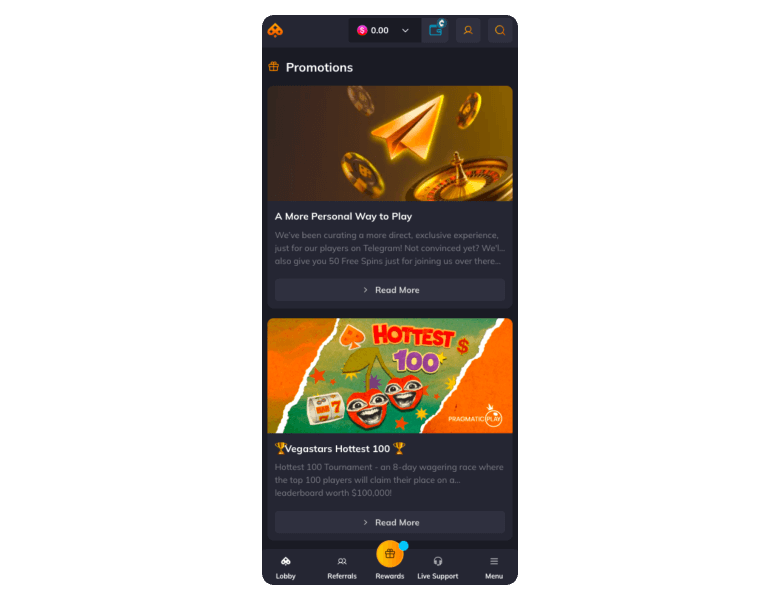Vegastars uses a black background so as not to take away from the gaming focus. Categorisations are neat and clear, and you’ll have filters available to find games of interest. The site is suited for North American users, loading all elements from 1.5 to 2 seconds with a 1 Gbps connection, which is enough for uninterrupted sessions.