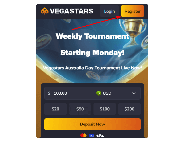 To play on Vegastars, you have to spend about a minute creating an account and making a deposit. Follow these steps: