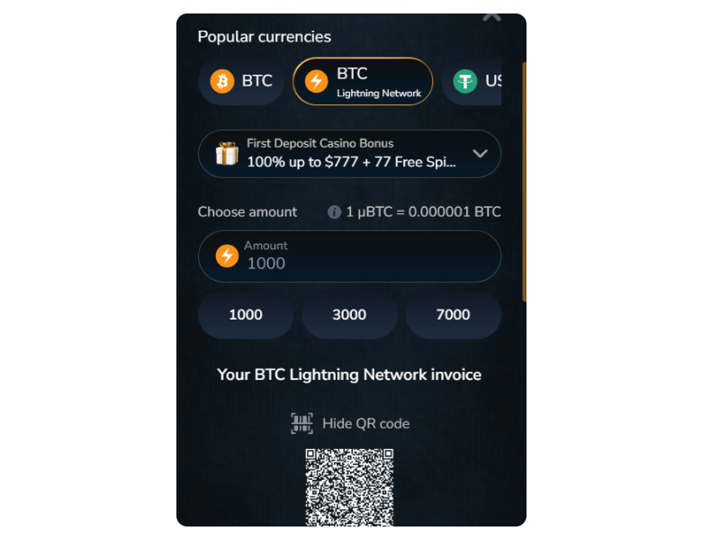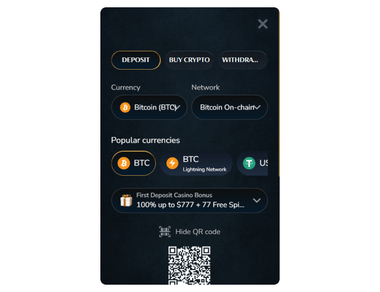 VIPcasino mostly accepts cryptocurrencies and is oriented towards crypto users. Deposits come instantly and require no fees.