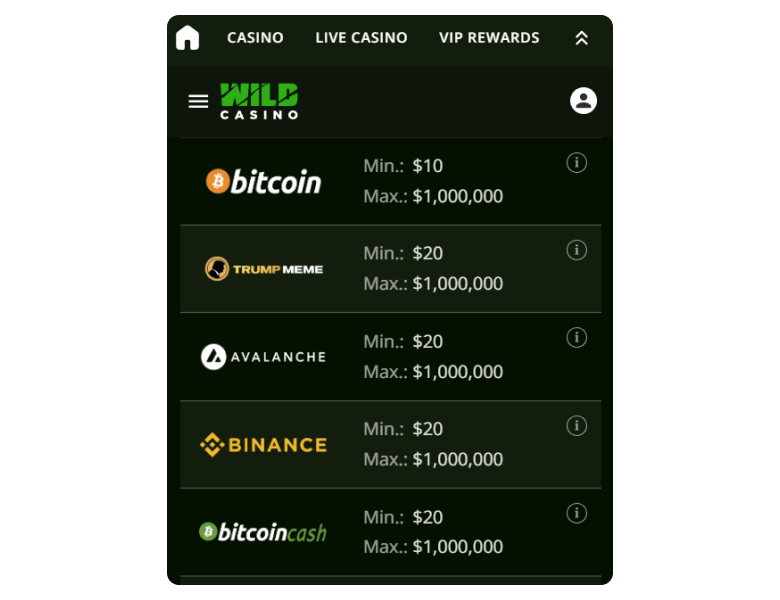 Wild Casino accepts credit cards, bank transfers, and a wide range of cryptocurrencies, including Bitcoin, Ethereum, Litecoin, and Ripple.