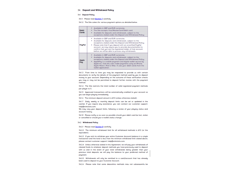 | Deposit methods | Deposit limits | Deposit time |