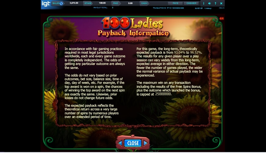 In general, 100 Ladies gambling machine has standard 5 game reels and an incredible amount of 100 possible pay lines, with the fixed wager: you can put only one coin of chosen value on each line. The range of rates varies from 1 to 30 cents.