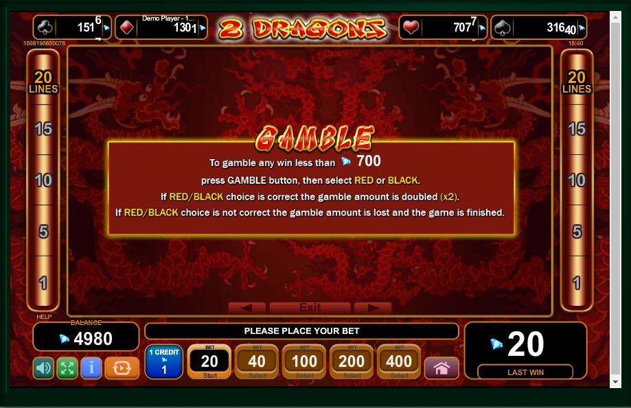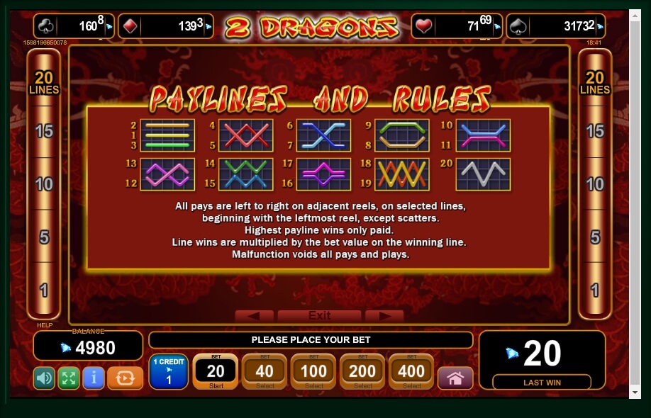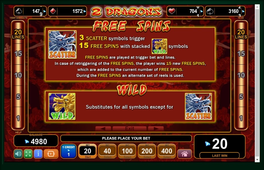 The game process of 2 Dragons takes place on five reels with 20 fixed prize lines, so a player can choose any number of them. The main screen of the slot is decorated using a traditional Chinese graphics: on the wallpaper with an appropriate ornament, the drums rotate. The game involves an instrumental Chinese folk music, which makes the whole process even more atmospheric.