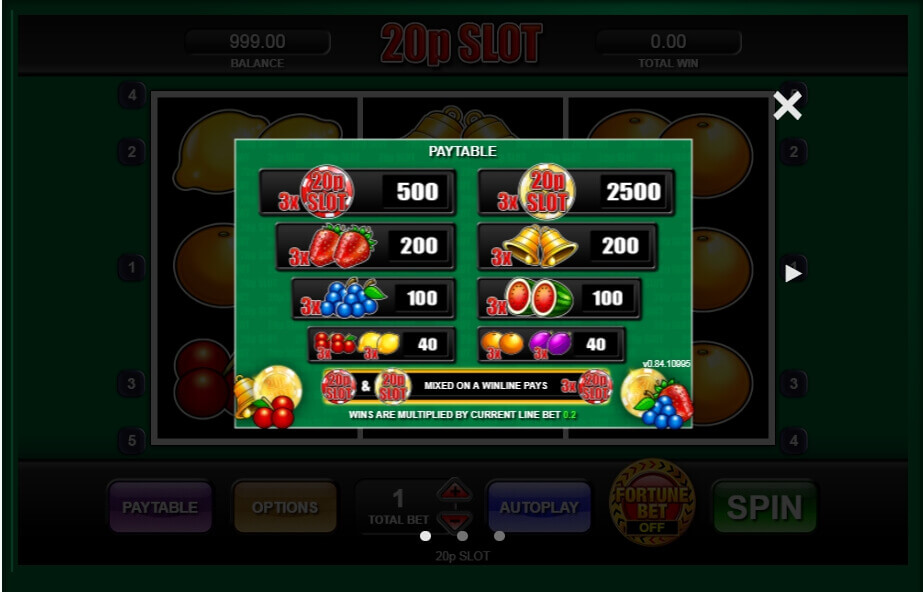 As for the gameplay of the 20p Slot online game, here you will encounter only 3(3) user-launched reels and only five win lines, that is not so bad if you wish to hit a few modest prizes for a start. The range of prizes is diverse and the highest of them is equal to 250,000 coins taking the shape of a tempting jackpot, while the chances of hitting such a high prize are also quite good.