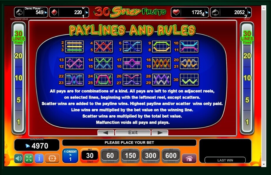 Welcome to the bright and expensive video slot game. The minimal bet is 30 coins. Players can bet up to 600 coins per a game! However, there are 30 paylines in this video slot game. Five reels and three rows in the height make 30 Spicy Fruits to be a kind of traditional games, as in total they form 15 spaces grid and offer gamblers to play with 11 available symbols. They are not stacked and quickly change each other in the game. It gives the gambler a chance to get as many winning combinations as possible. Just spin reels one by one and collect jackpots. By the way, there is the 720 000 jackpot presented in the game.