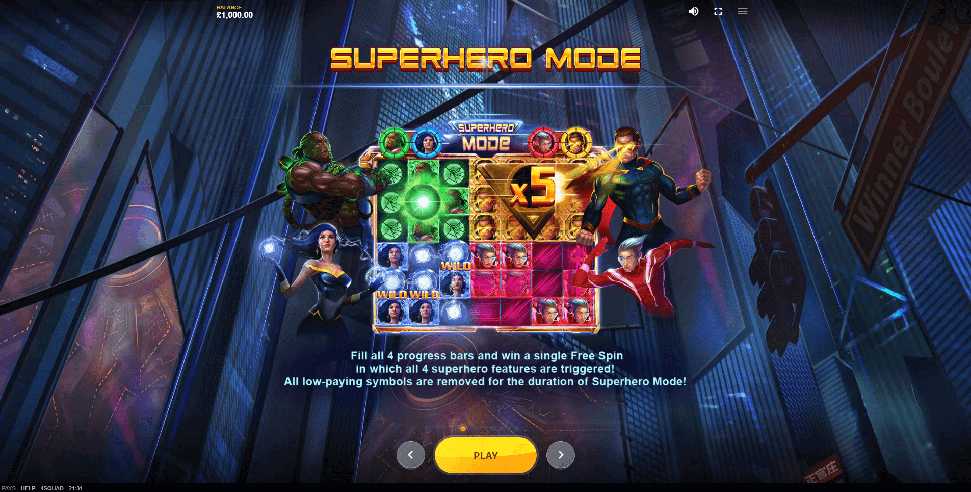 Bonuses and Features of 4Squad. This slot machine gives players the chance to score impressive payouts through 4 unique features. Each one is triggered when the meter of a superhero is fully charged by winning clusters of the matching color. And if you manage to charge all 4 heroes at once, 4Squad unleashes its main bonus round with the highest chances of landing a big win.