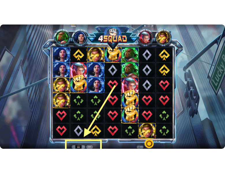 Play in 4Squad is simple. Just launch the demo mode on our site — no registration and no download required. This version is purely for fun, so all bets are placed with demo credits and all winnings are virtual. To claim real prizes, you’ll need to play this slot game at trusted online casino, after completing registration and making a deposit.