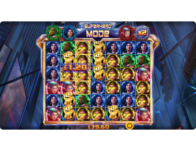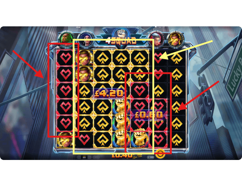 Burst. The red superhero streaks across the reels like a bullet, cloning any symbols in his path. With a bit of luck, this can create a massive cluster that covers half the grid — or even more. And in 4Squad, the bigger the cluster, the higher the payout for the collected symbols.