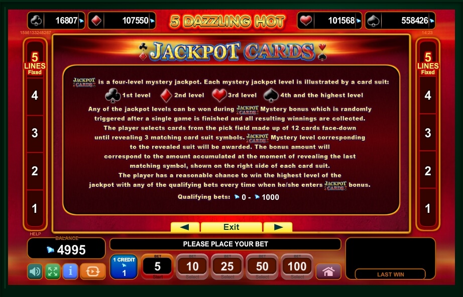 The 5 Dazzling Hot slot has a Mystery symbol with the logo of this game, which sometimes appears to provide an opportunity to hit the jackpot. A player ought to guess three cards of the same suit from twelve ones, which are face down. You can find the jackpot amount on the upper part of the screen.