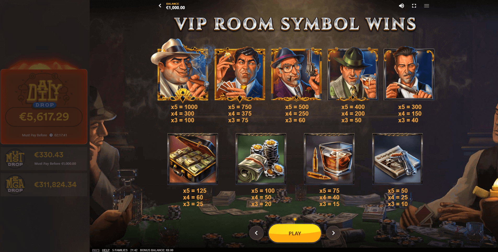 Regular Symbol Wins. When launching 5 Families, players can review the payout table to see how much each payline awards. For example, the cheapest symbol — the newspaper — multiplies the bet by x0.2 for the minimum combination, while the most valuable symbol — the gangster in a white suit — pays x2 for three matching symbols. Only the highest combination on each line is paid, counted from left to right, and payouts from multiple lines are summed up.