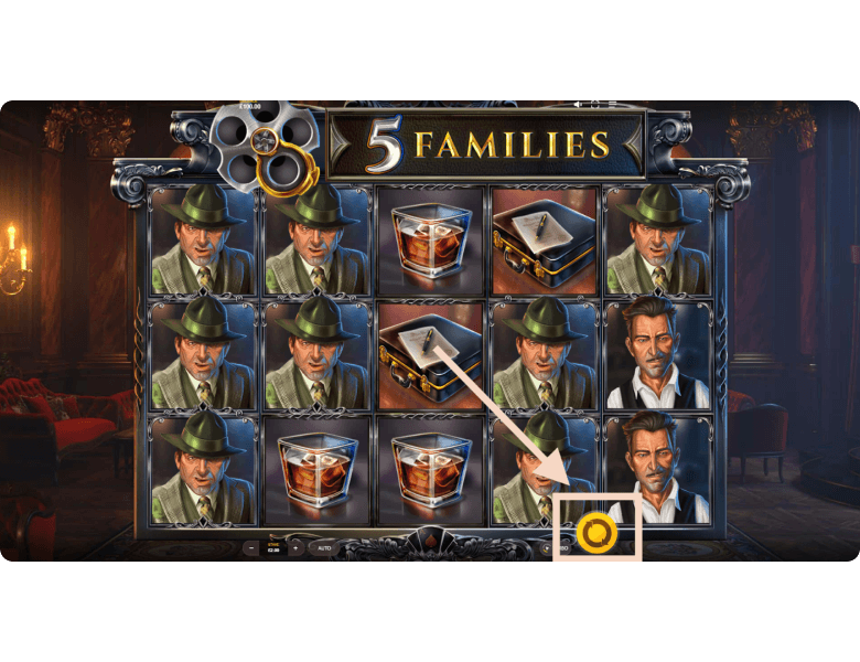 VIP Room Symbol Wins. Each winning spin loads the revolver, located at the top of the screen, with one bullet. Once the player lands five consecutive winning spins, the revolver’s chamber becomes fully loaded, and 5 Families switches into the VIP Room mode for playing with the best prizes. This is the second game mode, where the symbols not only look richer — they actually pay more. The same newspaper, now shown with a pistol, awards x1 instead of x0.2 for the minimum combination. The mafia boss in a white suit, now holding an expensive cigar, pays x10 instead of x2 for three symbols on a line. The player continues receiving payouts in this mode until five consecutive losing spins occur. When that happens, the game returns to the Regular Symbol Wins mode until the next series of five wins.