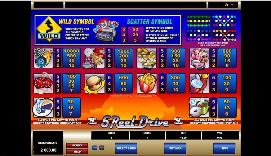 5 Reel Drive free casino slot also contains characters that help the user, making the gameplay more diverse and memorable. The Road Sign – the road that winds and takes the traveler away to new adventures – is the Wild symbol of the slot. The function of the wild symbol is well known – it helps in creating prize combinations, replacing bad icons for the user. It should be remembered that a wild symbol cannot replace the scatter symbol of a gaming machine. The scatter symbol is represented in the form of Police Car. It is not tied to the active lines and can be deployed in absolutely arbitrary cells of game drums. It is worth noting that the appearance of three or more scatter symbols on the screen of the 5 Reel Drive gaming machine promises to receive good payments, which the the payout table will certainly tell the user. The most valuable gaming symbol is a light caught by the wheel at the speed limit. If the user is lucky enough to collect a complete set of such spoiled rubber on the active line, then he expects to receive the maximum payout of the gaming machine. Other pictures on the online device 5 Reel Drive bring such multipliers:donuts with coffee – 6, 13, 50;
