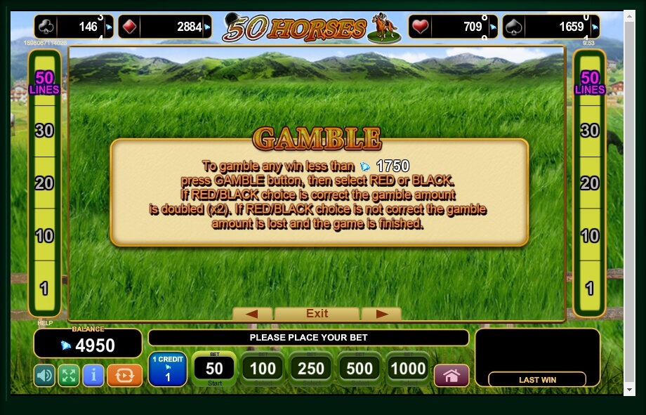 If the win is less than 700 credits per lot, each user can try to participate in the risk game. It can be started after pressing the “gamble” key. After that, a new screen will open, where a deck of cards is located on the table before the gambler. The player must guess at random the color of the hidden card.