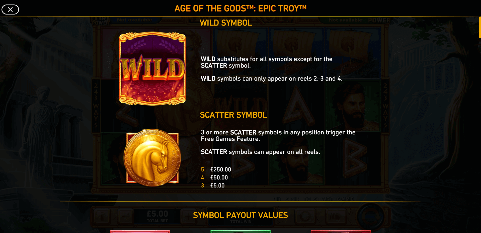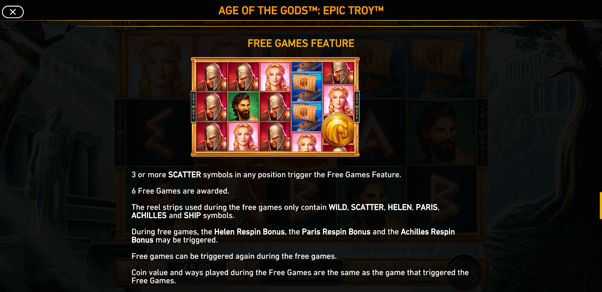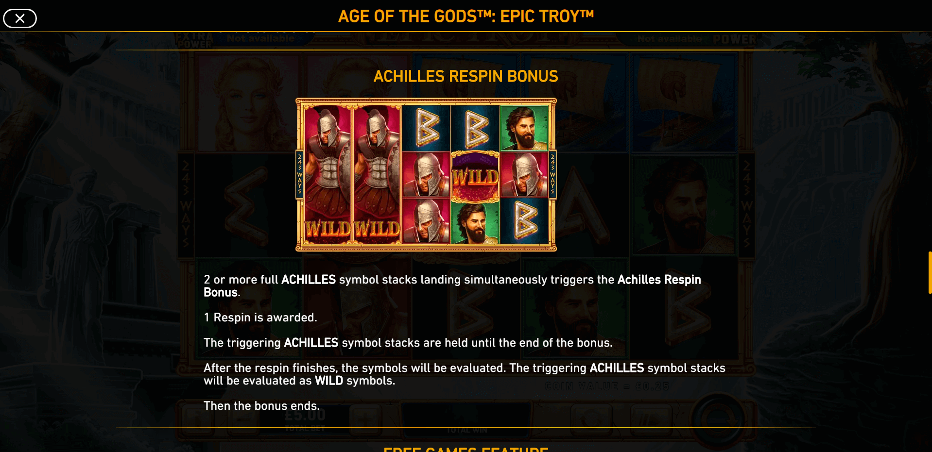 Achilles | Grants 1 extra respin. All triggering and newly landed Achilles symbols remain locked on the reels and act as Wilds during the payout calculation. |