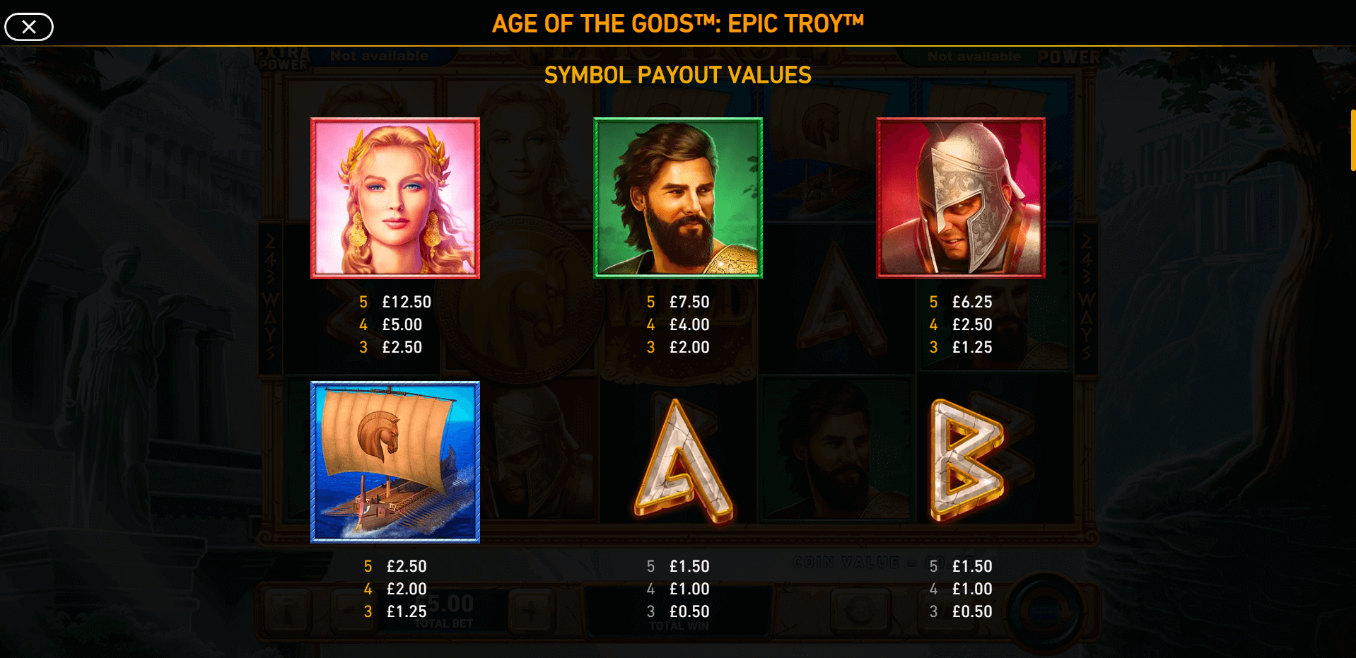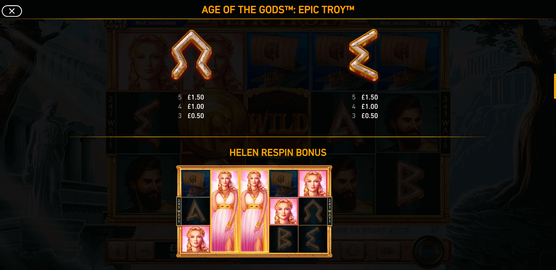 Helen | Triggers 3 respins. Each time a new Helen symbol lands, the counter resets back to 3. The respins continue until the reels are completely filled with Helen symbols or no new ones appear. |