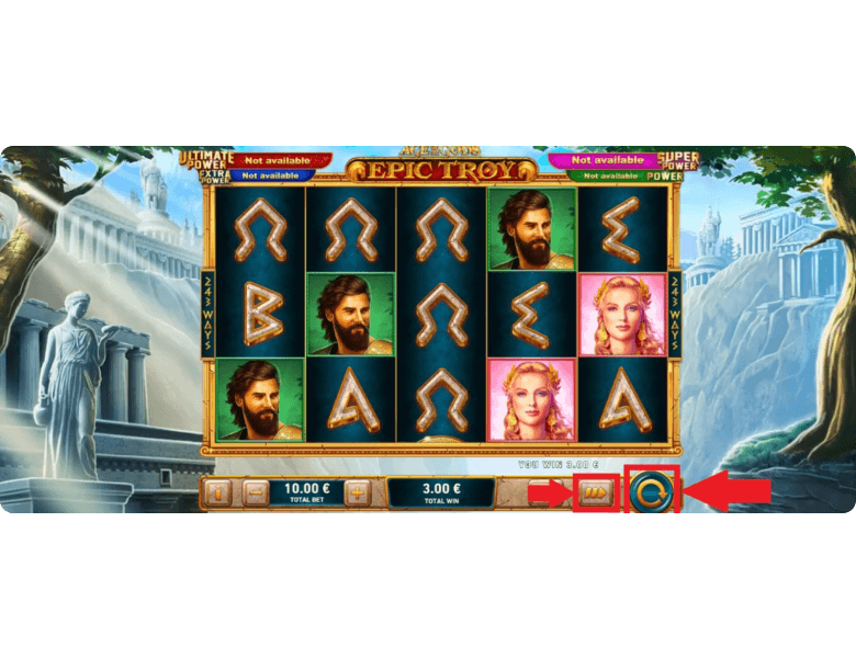 The large button with a circular arrow beneath the rightmost reel starts the spins. You can press it again to stop the reels at any time. The button with a right-pointing arrow activates three levels of turbo mode, speeding up the animations and muting win sounds for faster gameplay.
