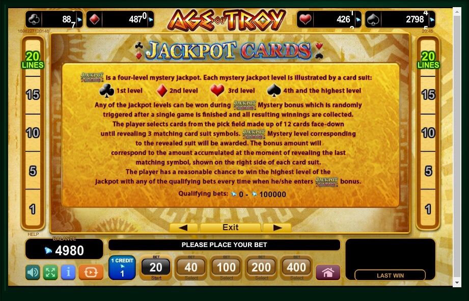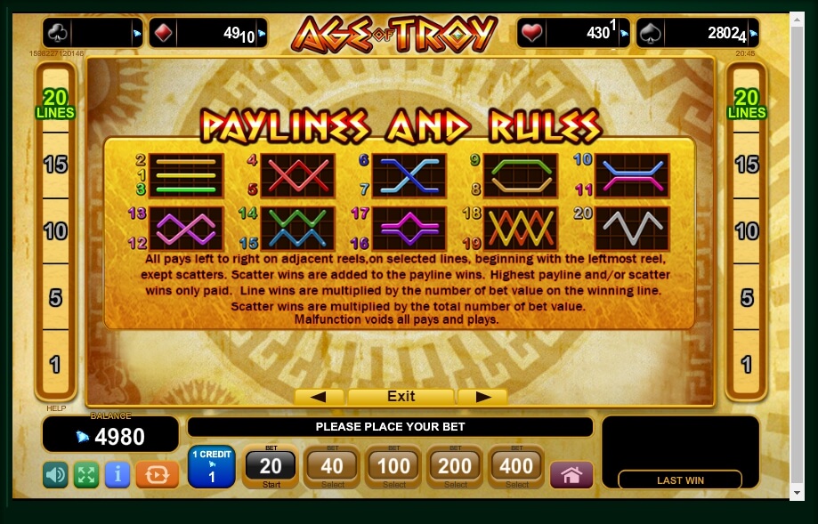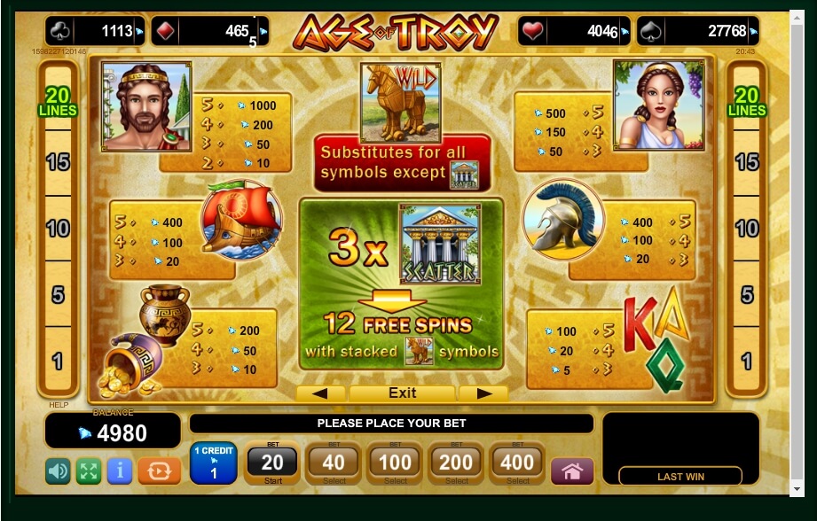 Age of Troy is a 5-reels and 20-pay-lines video slot machine produced by Euro Games Technology. The theme of Troy’s fall, displayed in many creations of painting, literature and cinema, has also become the main theme of this slot. A few lines about this ancient marvelous story. The Trojan prince Paris fell in love with Helen, the wife of the Spartan king Menelaus. He managed to persuade the beautiful girl to escape. While there was no husband, the couple in love sailed to Troy.