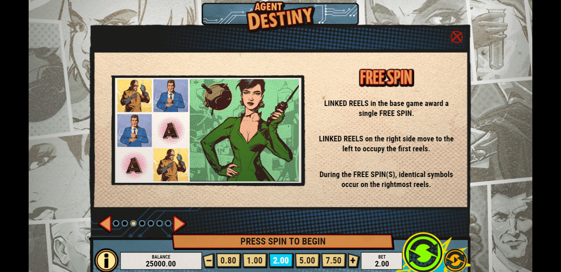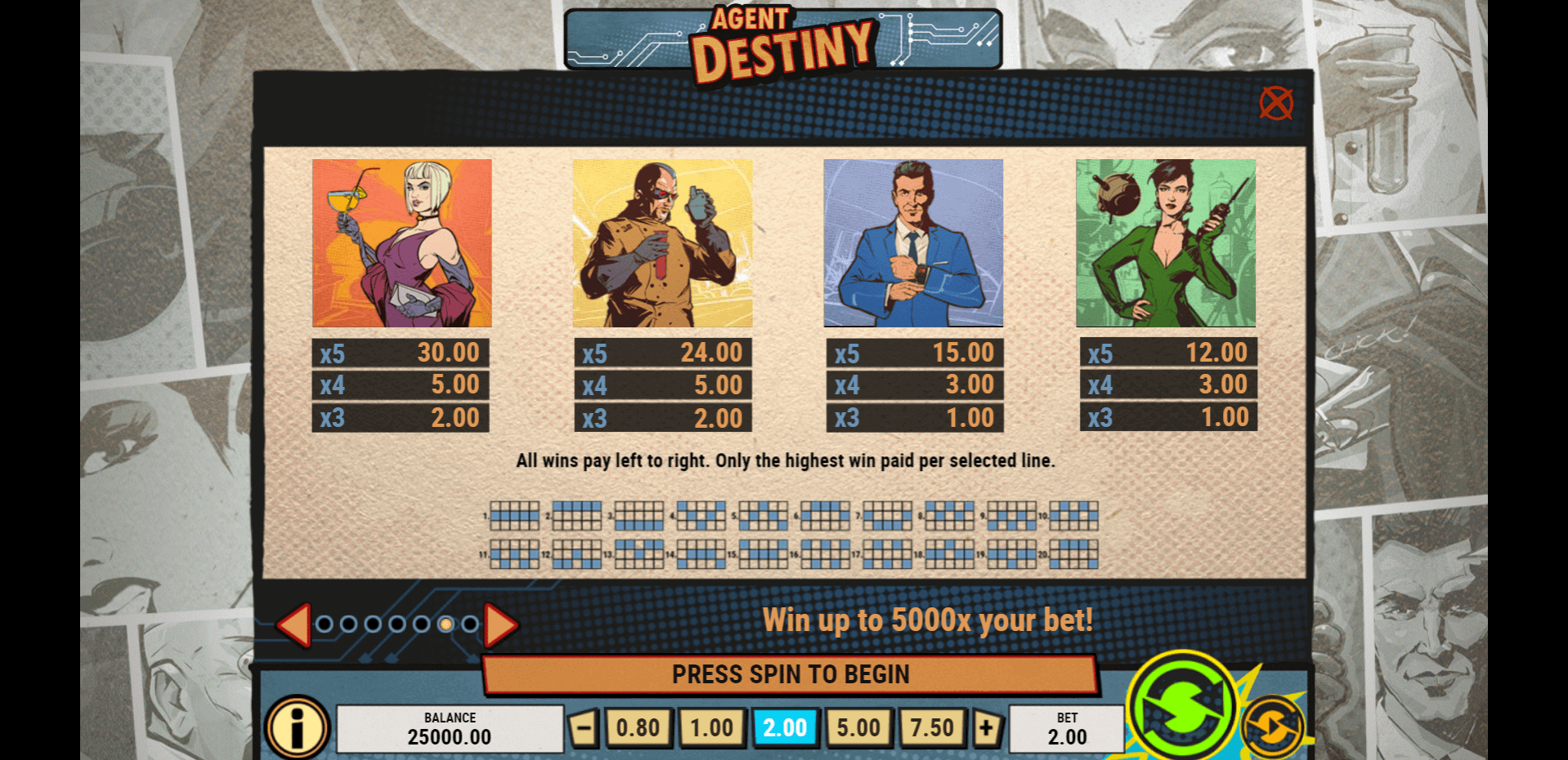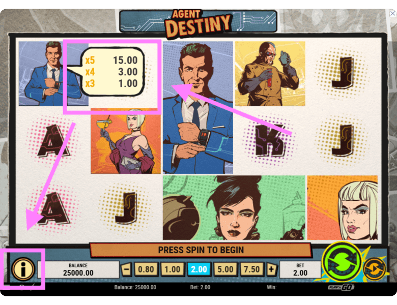 Players can easily check the value of each symbol in Agent Destiny by clicking on it directly on the reels — the payouts will adjust automatically based on the current bet size. Alternatively, you can open the general Info tab to view all the paytable multipliers clearly displayed in a single table.