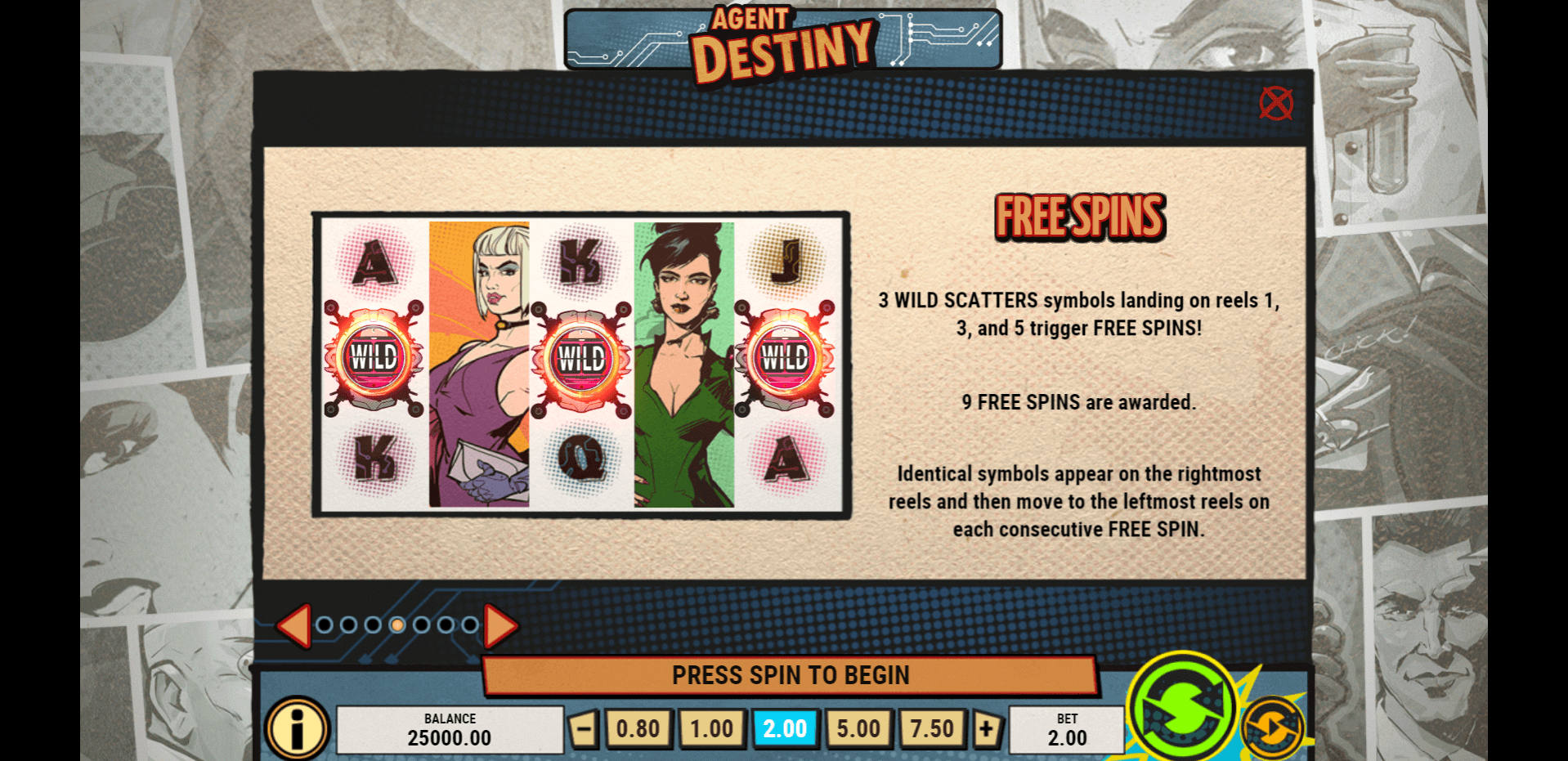 Agent Destiny also includes a full-on Free Spins round. Landing 3 Scatter symbols anywhere on the reels awards 9 Free Spins. During this bonus, identical symbols tend to appear further to the right, gradually moving left with every spin. This shifting mechanic keeps the action dynamic and adds more excitement to the gameplay.