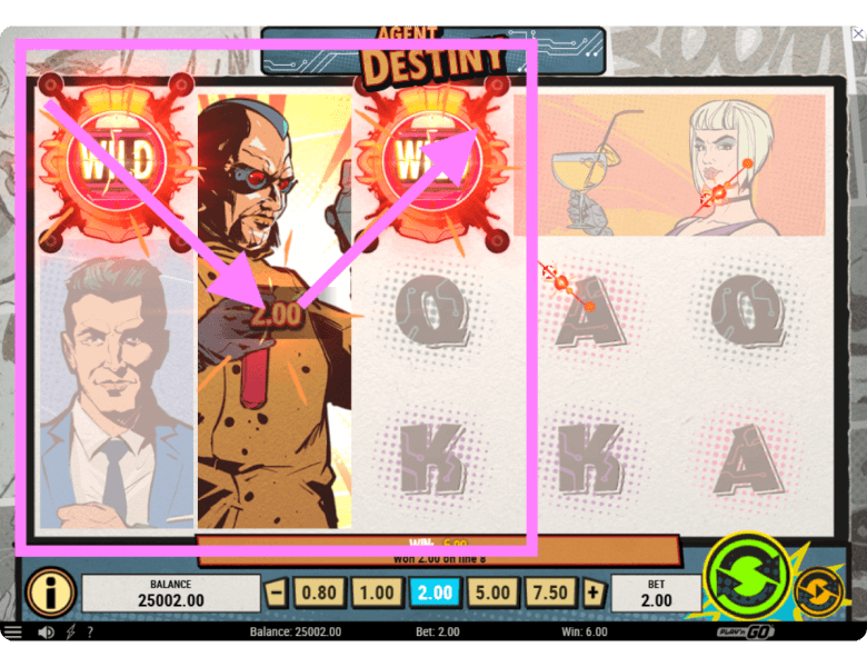 The Agent Destiny online slot features not one, but two types of Wild symbols. The black Scatter Wild substitutes for any card value or character symbol, and landing three Scatters triggers 9 Free Spins. This special Wild only appears on reels 1, 3, and 5.