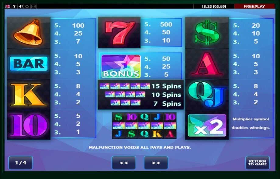 Before the game starts, you should look at the paytable by activating it with a special button. There you can find all information about awards, possible options for payments and free spins. There is no wild symbol here.