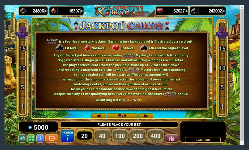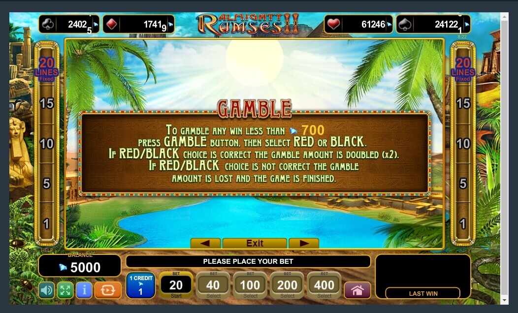 Playing the Almighty Ramses II video slot machine, gamblers risk to win the 200 000 jackpot per one gambling session! It is quite a good reward for the short game. The minimal bet is 0.10 coins per one winning combination. The maximal bet in this slot game is 10 coins per one payline. To regulate a bet, the player has to press the “plus” and “minus” buttons on the bottom of the interface. Such a wide betting range makes this game available for everyone who wants to play it.