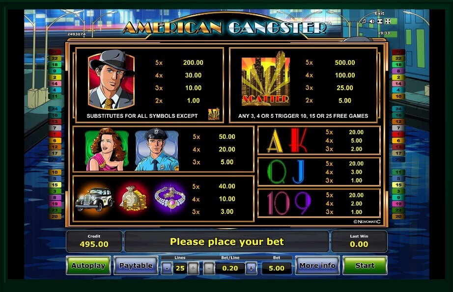 A joker (gangster) makes chains according to general rules and also replaces all base pictures if necessary. Scatter is paid regardless of the location on the monitor. In this case, the amount of payment depends on the rate. Moreover, 3-5 such pictures give 10-20 free spins. Extra Wild will also take part in this round. They show multipliers from x2 to x10, which are taken into account when calculating payments. This round can be extended. The main prize is 250 thousand!