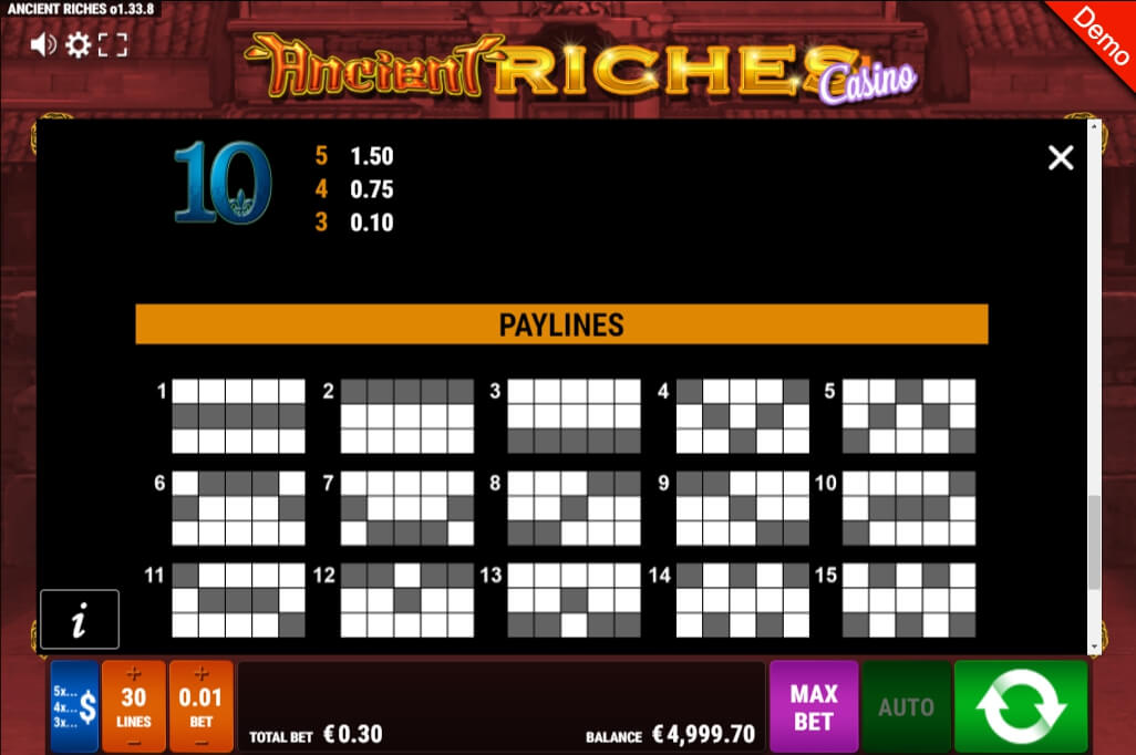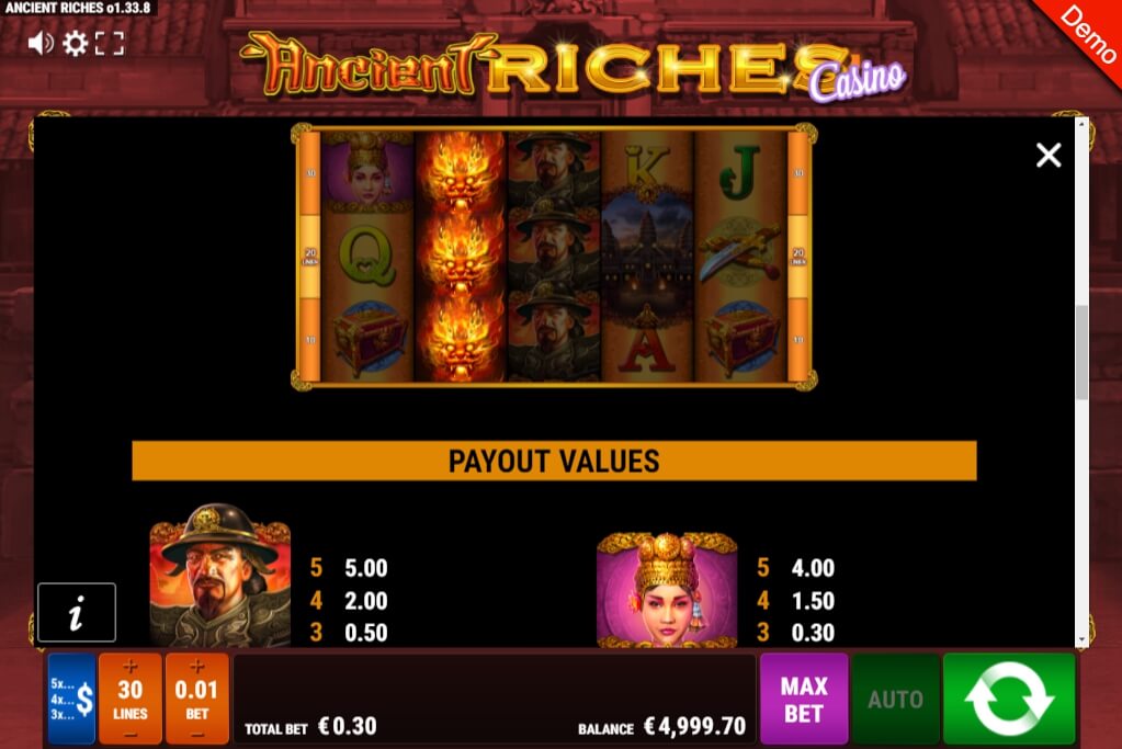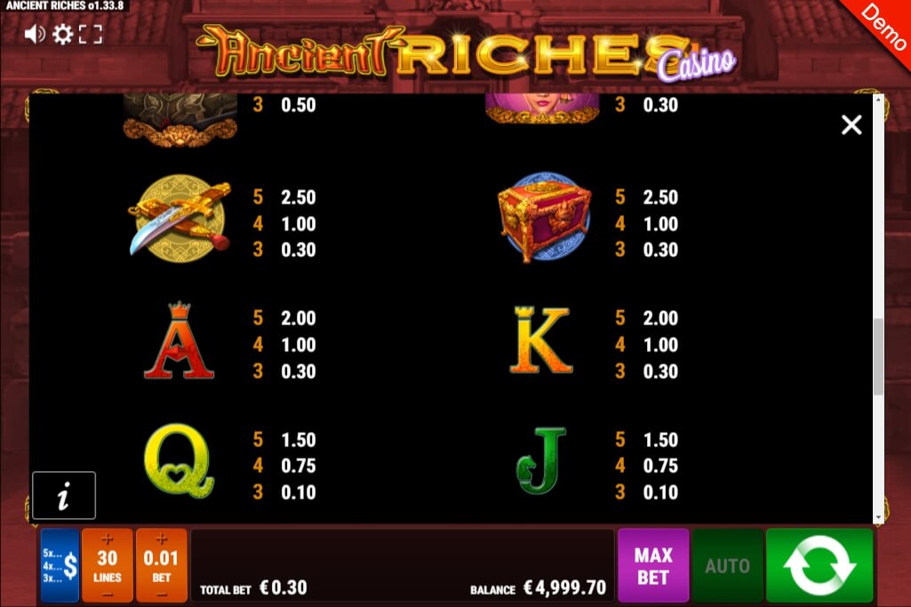 The Ancient Riches video slot machine can be found on the website of any online game portal if you want to play on real money. However, you also may try gambling for free on our website. There is no payment needed to get some fun spinning the reels. Moreover, there is no registration and no downloading required as well.