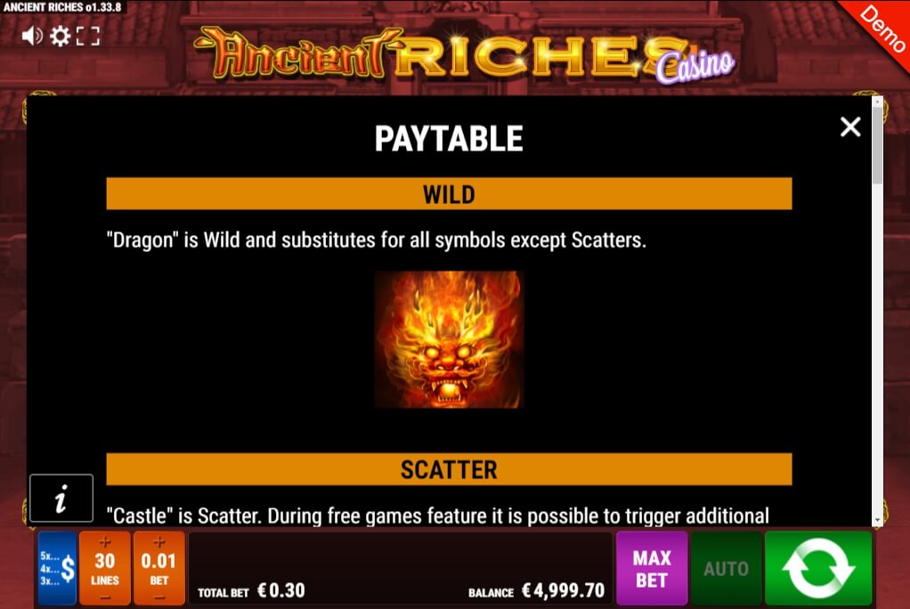 The Ancient Riches video slot game can offer players spin the reels and play with a wild symbol that is presented on the screen with a fire ball. The wild symbol can be found on any reel and acts like a replacement to all other symbols, except for scatter.