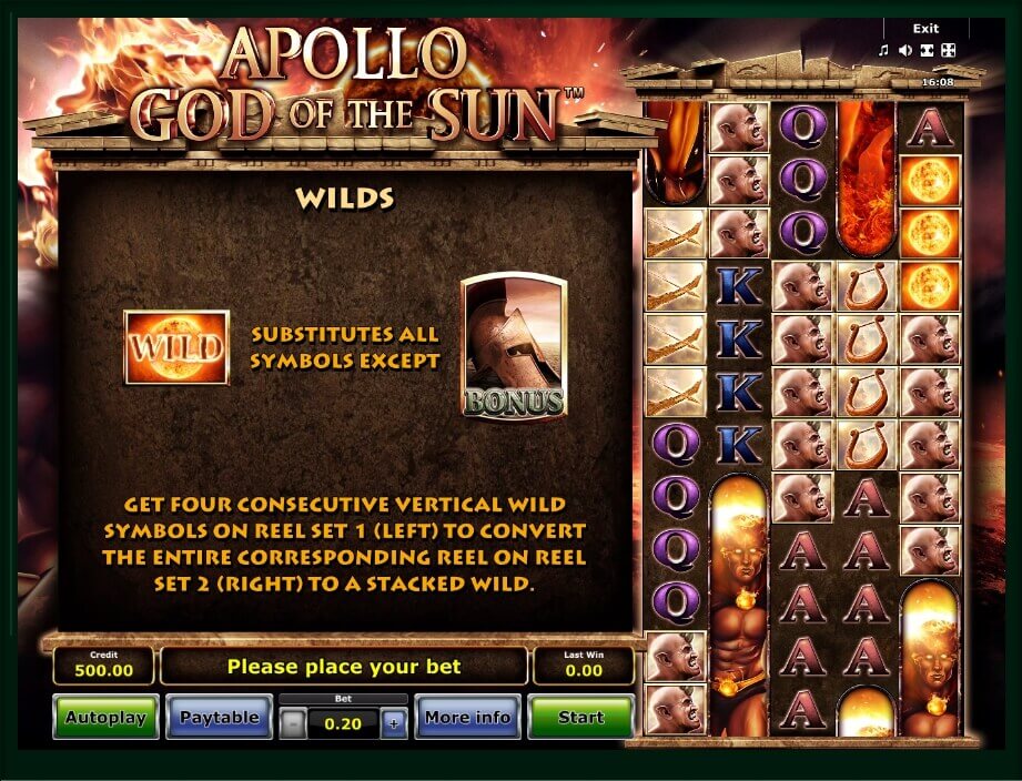 After the game opens you will see a fantastic picture. We have no words to describe this. In the background there is a volcanic eruption, lava flows and also the sun whose power is concentrated in the hands of Apollo. Here, also the God who is preparing to strike at his enemies is depicted. Such an atmosphere of the slot machine is supplemented with fantastic animations and 3D effects. The musical accompaniment is professionally chosen.